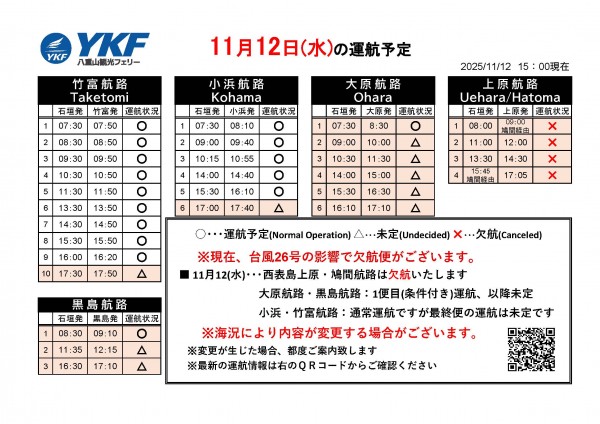 小浜・竹富航路:通常運航ですが最終便の運航は未定です