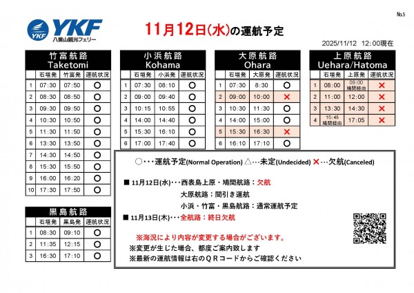 ■ 11月12日(水)・・・西表島上原・鳩間航路は欠航